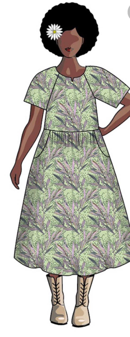 The Sewalong is the beginner friendly Ripple Dress. It is a loose-fitting, peasant-style frock perfect for skipping through meadows! It has a boxy bodice with a notched neckline and elbow-length raglan sleeves. The gathered skirt has spacious cut-out pockets. This everyday dress pulls on over the head with no need for a zip, and there are two lengths (knee length and mid-calf) to choose from.