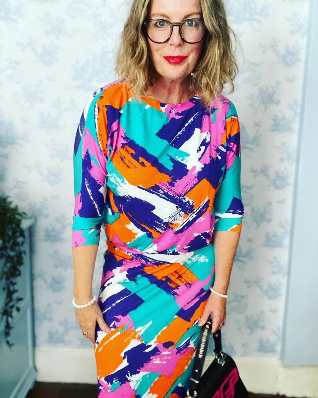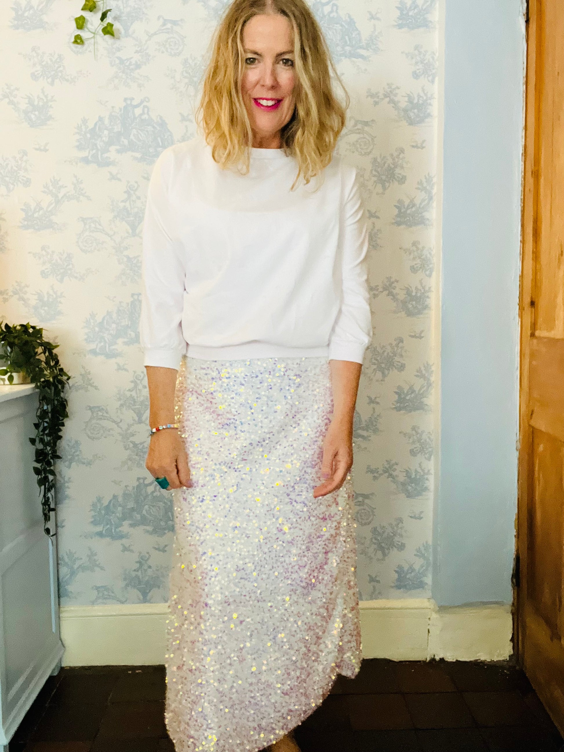 The gentle fluid lines hugs the body without being too restrictive. The top has a batwing sleeve, cuffs and a chunky waistband. The skirt is straight with a slight flair also finished with a chunky waistband.
