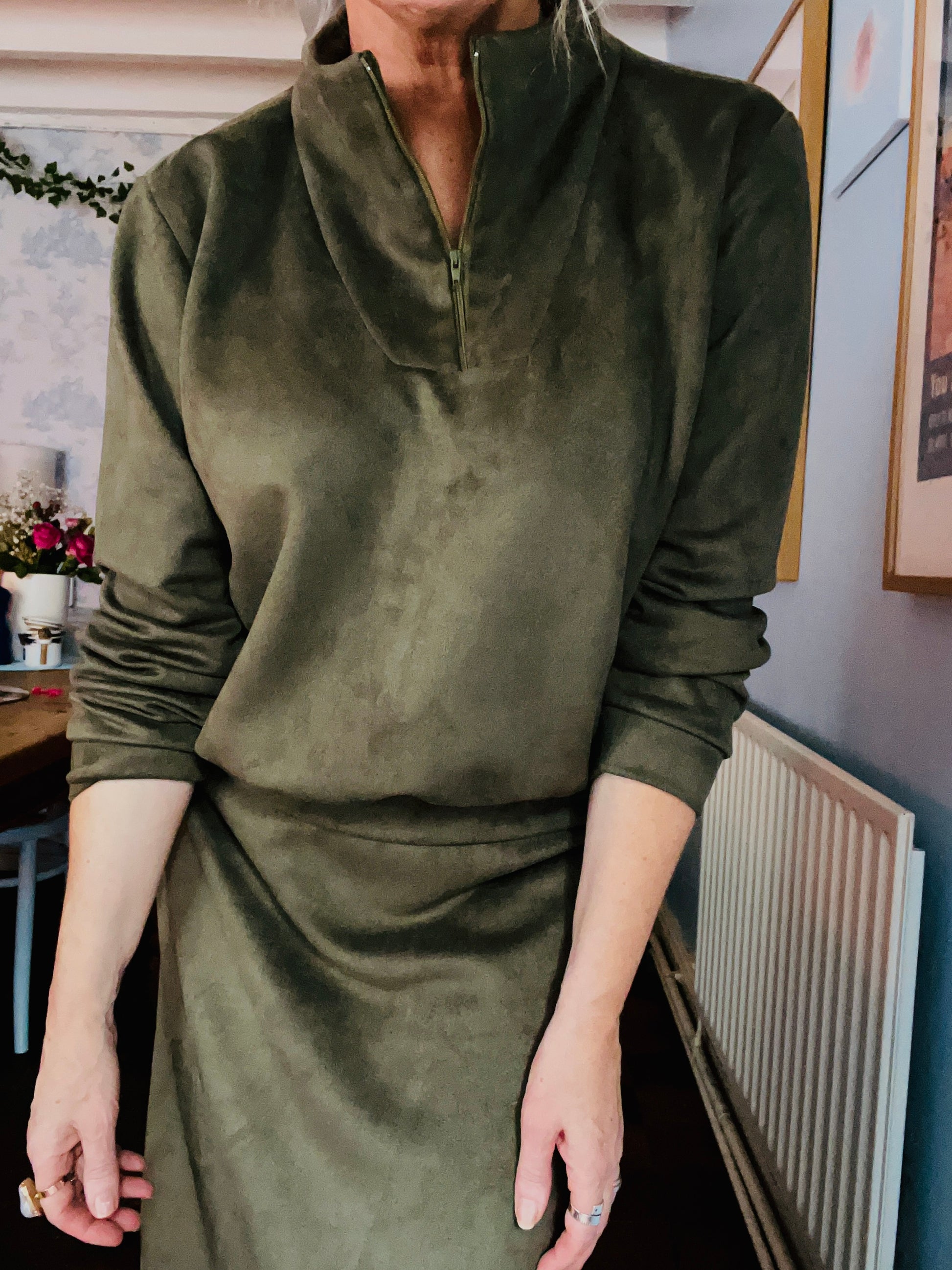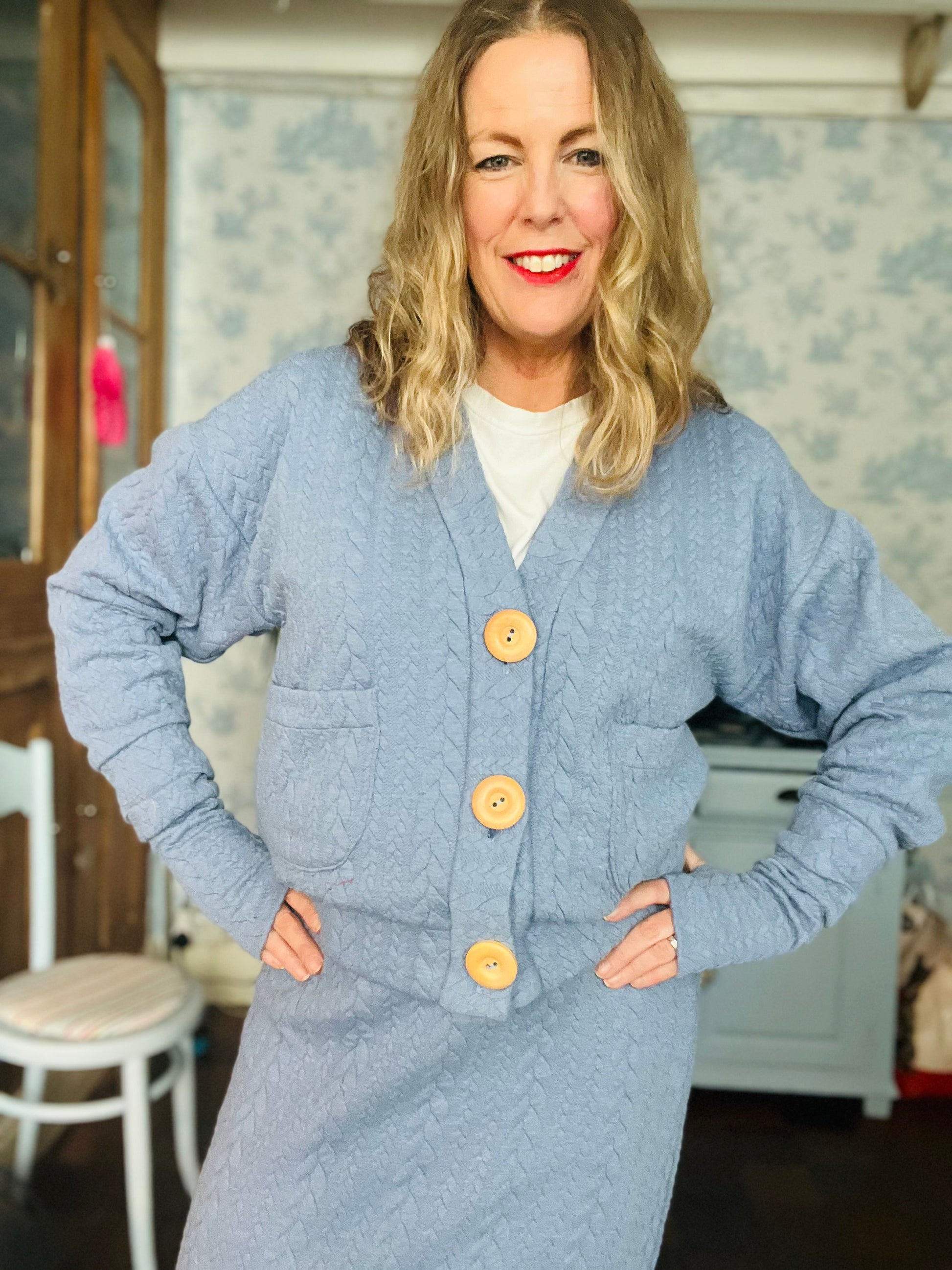 We have two sew along choices: the True Bias Marlo (blue cardigan below) or the Allie and Olson Hive Pullover (in green stretch suede). Or you can make a garment of your choice - but keep it cosy!
